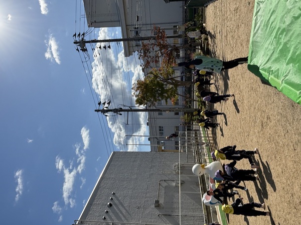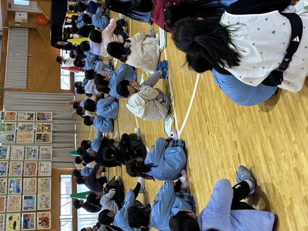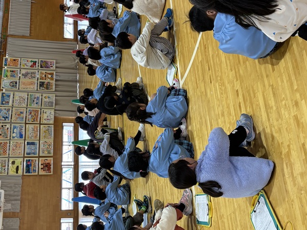 11月12日:近くの上組小学校の校内絵画展に5歳児が招待され、お天気に恵まれて片道30分歩いて行ってきました。2年生の子ども達も楽しみに待っていてくれた様子があり、運動場に集まるとお互いに笑顔になって、これから案内をしてもらう絵画展がとても楽しみになりました。