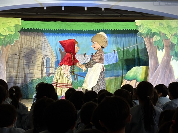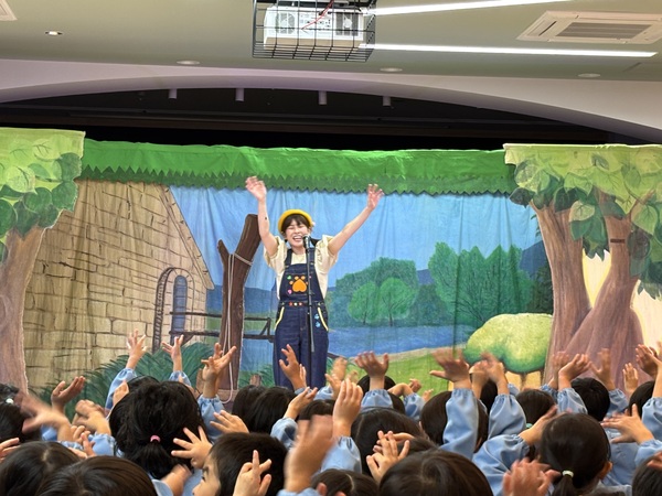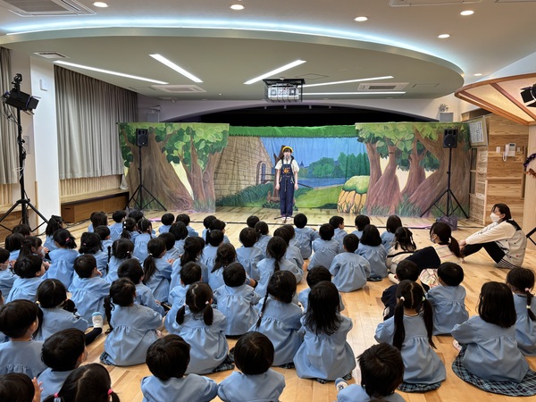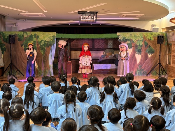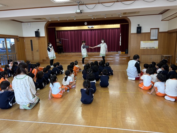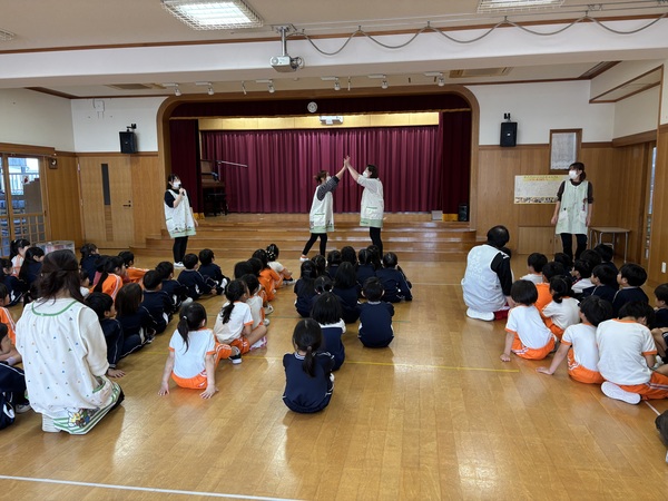 10月28日は劇団飛行船の人形劇ミュージカル「赤ずきん」があり、午後から3歳児、4歳児、5歳児の子ども達が観ました。初めにナナお姉さんが🎵おいで、おいで〜♪と歌いだし、体を使った遊びが始まると、眠そうだった子ども達もシャキ!準備OK!