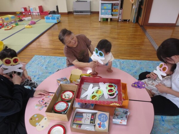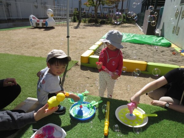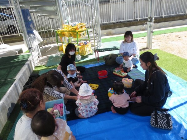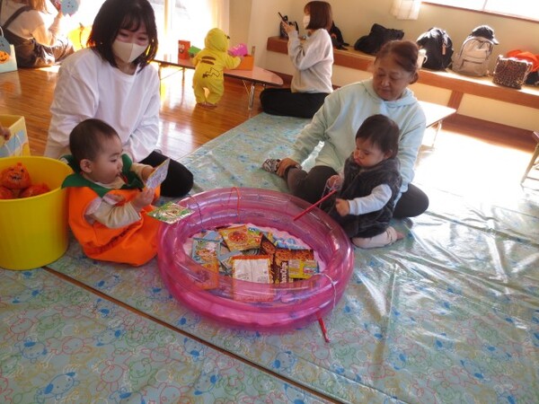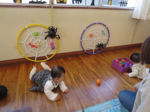10月前半はシール遊びや新聞紙遊び、こども園の園庭でも遊びました。園庭の日は汗ばむくらいのいいお天気でした。製作ではランタン風かぼちゃを作りました。ハロウィンにピッタリ!