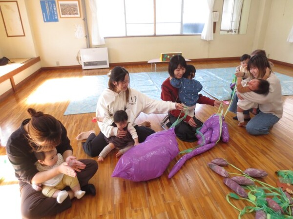 最初は両方の子ども達が少し緊張気味でしたが、一緒にダンスを踊ったり、”猛獣がりに行こうよ”や、”電子レンジおにごっこ”をするうちにすっかり仲良しになりました。