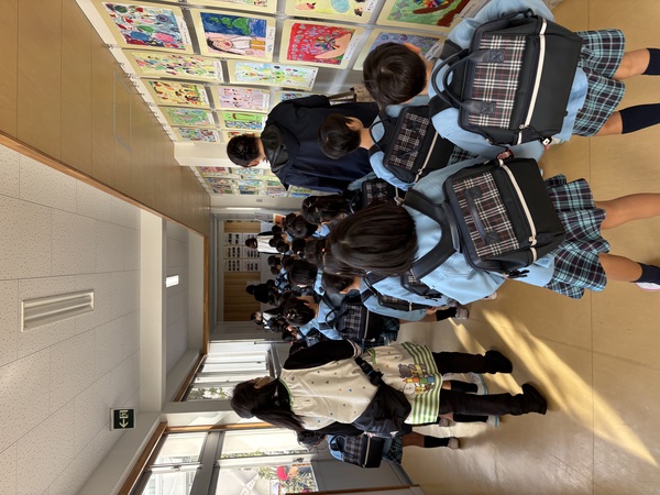 小学生に手を繋いでもらい、3〜4人のグループを作り、絵の説明をしてもらいながら1年生から6年生までの力作を鑑賞しました。