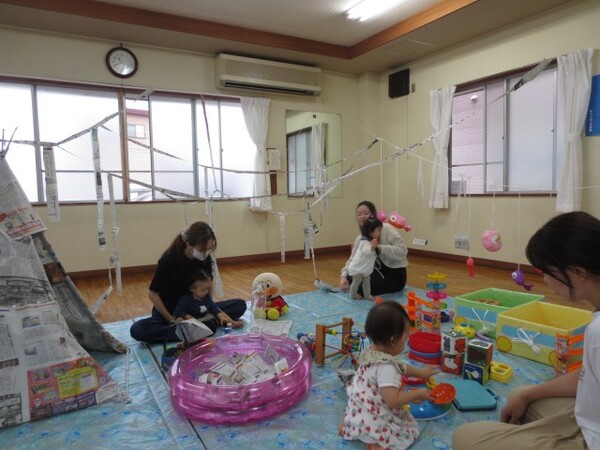 全園児で取り組んだ夏まつりごっこです。かき氷屋さんやジュース屋さん、千本くじやしゃげき砲、むしとりなどのゲーム遊びを楽しみました。子どもたちが考えて、店番や買い物する子など、交代制でやりました。