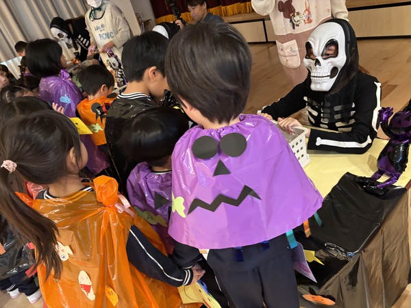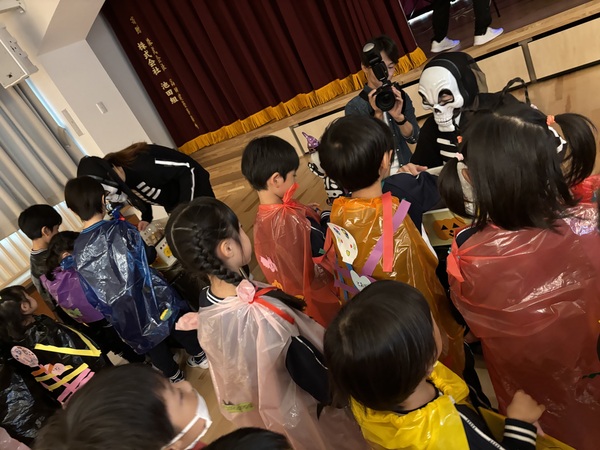 3・4・5歳児は自分達で思い思いのマントを作って運動場に集合です。2歳児はお化けのお面、1歳児はカボチャのお面、0歳児はかわいい猫ちゃんのお面で集合!