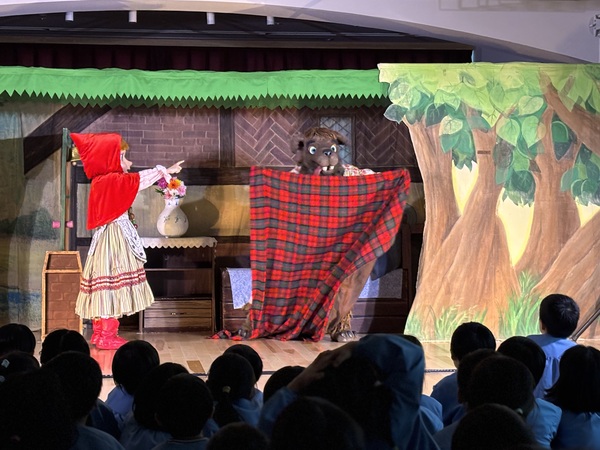 かわいい赤ずきんが登場すると目がキラキラ✨、オオカミが出てくると怖くなり先生のそばに寄っていく子もいました。おばあさんになりすましたオオカミに赤ずきんが話しかけると、「オオカミだよ‼オオカミ‼」と大合唱。