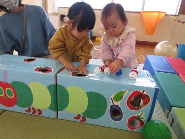 10月前半はシール遊びや新聞紙遊び、こども園の園庭でも遊びました。園庭の日は汗ばむくらいのいいお天気でした。製作ではランタン風かぼちゃを作りました。ハロウィンにピッタリ!