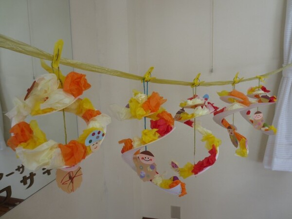 11月はボール遊びやシール遊び・運動遊びなどがあり、製作では紙皿を使って「秋のモビール」を作りました。
